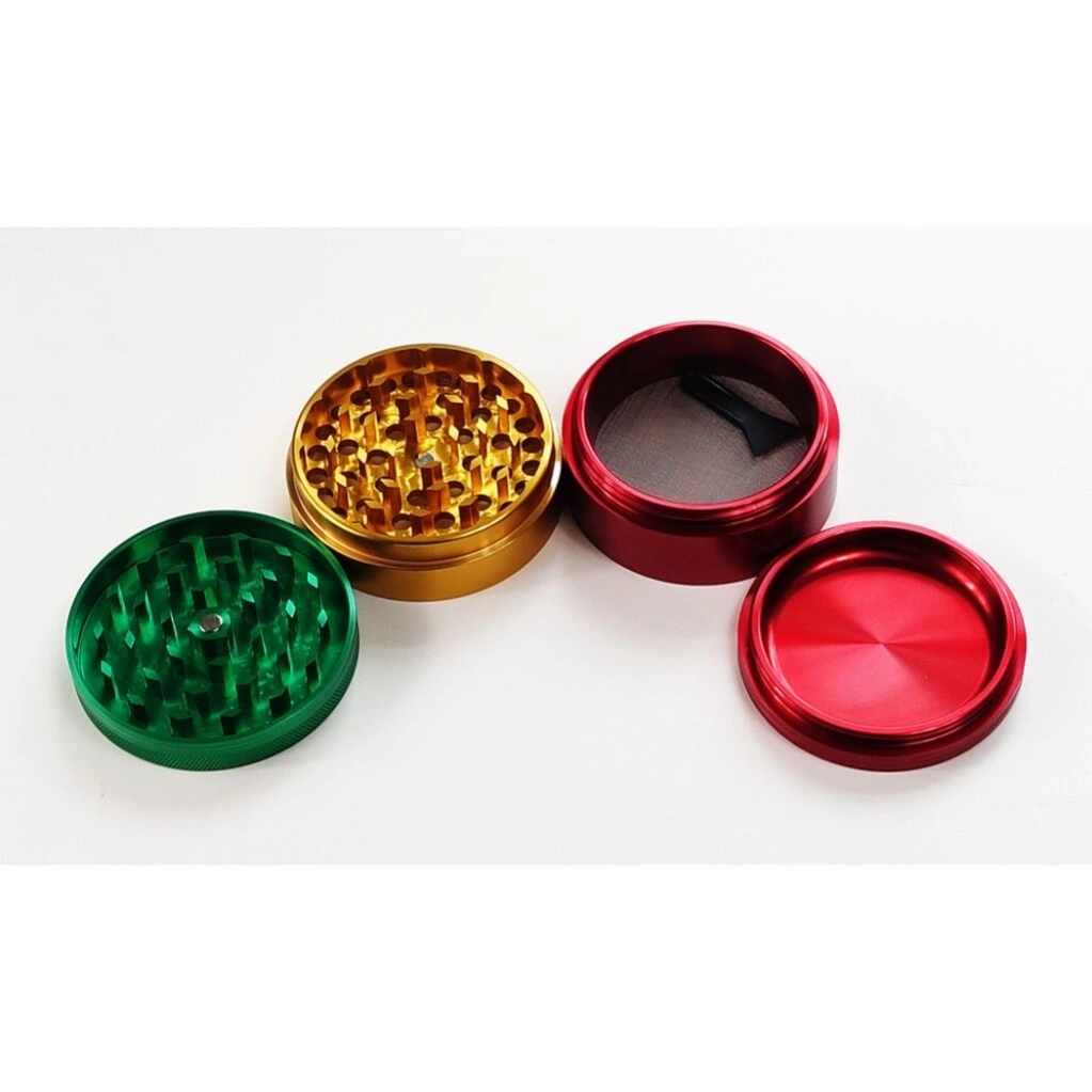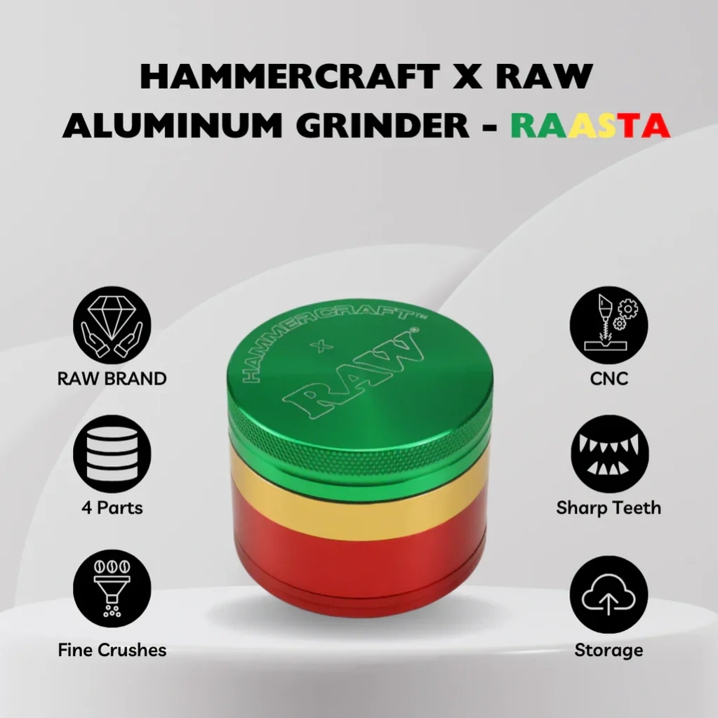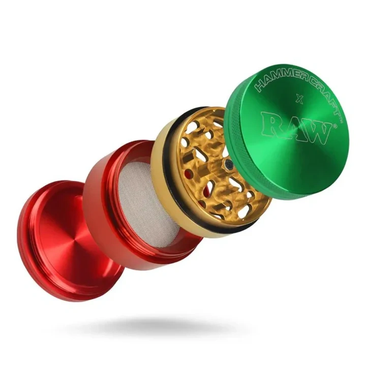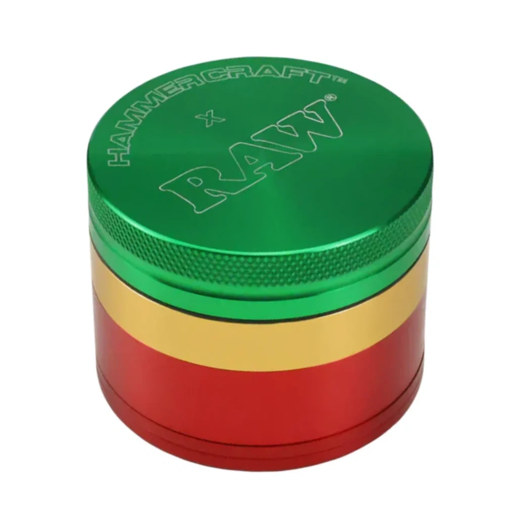 This is the Rasta Medium Grinder from HAMMERCRAFT. It is medium and offers ample space to grind a larger quantity of your favorite herbs at once. The individual parts have the characteristic colors - green, yellow and red. The upper part is held in place by a magnetic catch and the other parts are screwed together. As it is made of aluminum, the grinder is lightweight.
